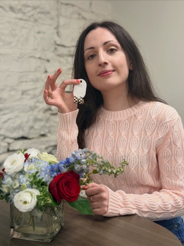 Да, я заказала его, он сделан вручную моей хорошей подругой. На нём написано «St. Louis Chess Club», есть шахматные фигуры и цвета клуба. Пока что это очень счастливый браслет. У меня есть ещё два похожих: один обычно для Олимпиады с американским флагом, другой — для моего немецкого шахматного клуба.