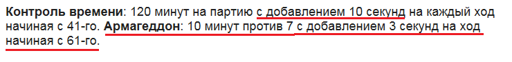 Jacob08: Лишь сейчас, благодаря нашей главной странице (!), заметил изменение (смягчение) регламента контроля времени в классическом турнире, а также изменение контроля времени в дополнительной партии, играющейся в случае ничьи в классике.