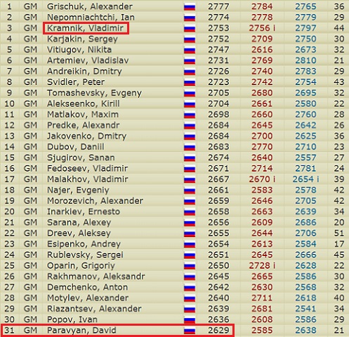 Возможно с 2646 (2645 была описка) в марте Давид Паравян войдёт в российскую Tоп25, поскольку у Крамника сегодня последний день в списке ФИДЕ. А может и выше после Аэрофлота ?