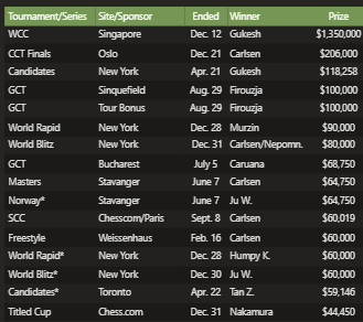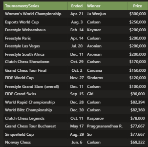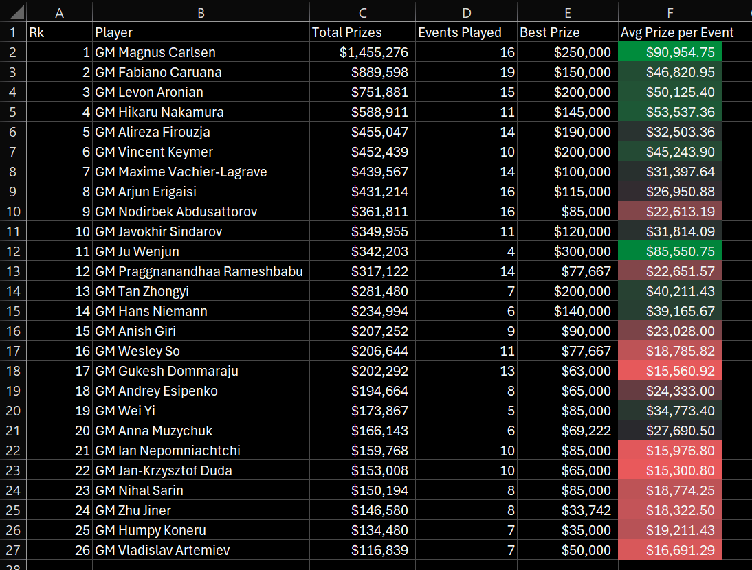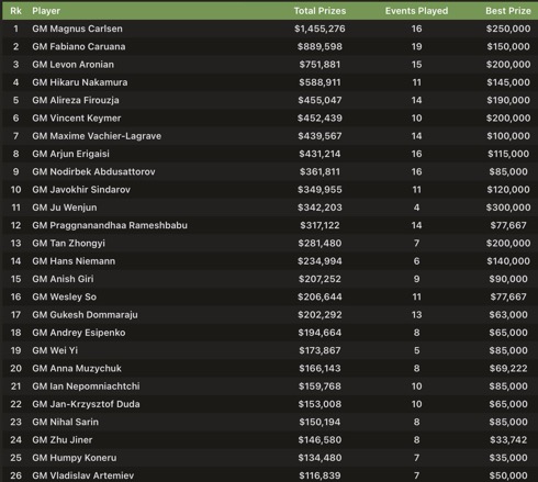 В общей сложности 26 игроков достигли шестизначных сумм в 2025 году. Это значительное увеличение по сравнению с 17 игроками в прошлом году, благодаря возвращению крупных турниров, проводимых только в нечетные годы, таких как Кубок мира ФИДЕ и Гранд-швейцарский турнир , включению шахмат в Кубок мира по киберспорту и проведению серии Freestyle Grand Slam в течение всего года.