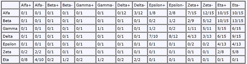 Статистика по всем расстановкам. Интенсивность красного цвета показывает процент выигрышей сильнейшей стороны. Интенсивность синего цвета показывает количество успешных защит. Когда сильная расстановка, причем, у белых или черных фигур, противостоит слабой, процент выигрышей наибольший. |