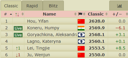 Women’s #6 Lei Tingjie (2545) faces #8 Tan Zhongyi (2526) for the right to challenge the current Women’s World Champion, Ju Wenjun.