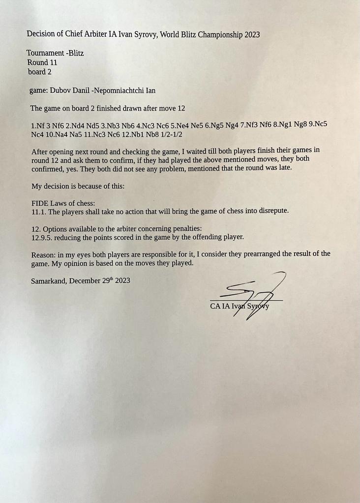 Decision of Chief Arbiter IA Ivan Syrovy regarding the Dubov-Nepomniachtchi game.