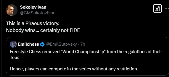 «Just want to pass a message to you and Magnus that whatever happens between FIDE and Freestyle in terms of recognition, players will NOT be affected in any way. They can decide on their own and FIDE will not take any negative action.»