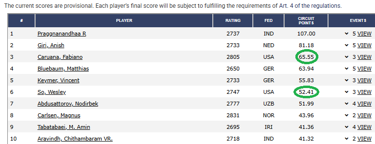 Зачет ФИДЕ-цирка после чемпионата США