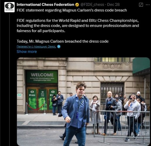 Неужели на научные конференции и собрания продаются билеты для зрителей по немаленькой цене? (как в том же НЙ на ЧМ по шахматам?). Предполагаю, что нет. А потому эти собрания не являются коммерческими шоу, на которых кто-то пытается зарабатывать деньги. И их участники могут ходить на них в чём угодно, не нарушая административный кодекс, разумеется. В отличии от шахмат. Вот зачем вообще в жизни нужны шахматы? Единственный разумный ответ - для шоу, для развлечения зрителей, которые готовы заплатить за своё развлечение деньгами. А артисты, участвующие в шоу, обязаны соблюдать его правила, в том числе установленный организаторами дресс-код. Если жонглёр в цирке, к примеру, скажет, что мне удобнее будет выступать в костюме клоуна, ему это разрешат? Разумеется, нет. Отправят переодеваться и не выпустят на сцену, если он откажется. А Карлсен сознательно пришёл играть в шахматы, нарушая установленный организаторами дресс-код (он ведь не мог не знать, что джинсы запрещены!) Что это, зачем? Непрофессионализм? Раздолбайство? Желание вызвать конфликт? И уж совсем мне не понятно нежелание переодеться между партиями... Ты же виноват, ты нарушил контракт! Чувствительная натура? Ну так не играй изначально, если не согласен с требованиями контракта, какие проблемы? |