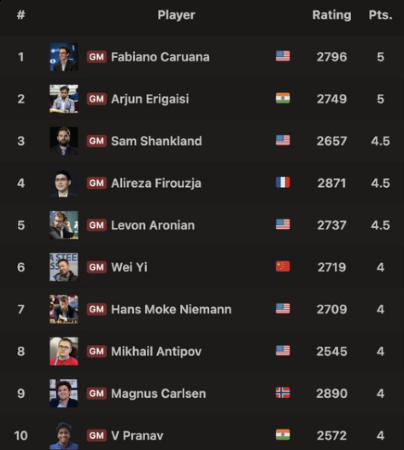 Место в FIDE Circuit уже решено в пользу Фаби, но в 6-м раунде блица они сыграют друг с другом как единственные игроки с идеальными 5/5!