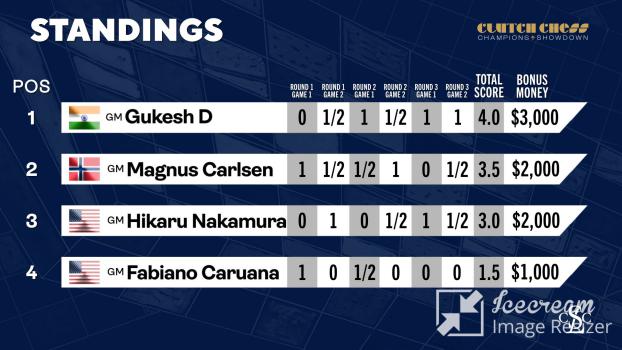 Гукеш одерживает блестящую победу над Фабиано Каруаной, завершив первый день Champions Showdown. Благодаря победе 2:0 над Фаби в третьем туре, Гукеш теперь единоличный лидер с 4 очками из 6!