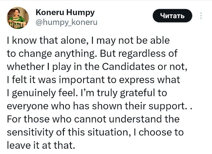 Хотя неопределенность сохраняется, потенциальный отказ Хампи от участия может быть связан не только с пропуском турнира претендентов, единственного пути к матчу на первенство мира, но и иметь более серьезные финансовые последствия.