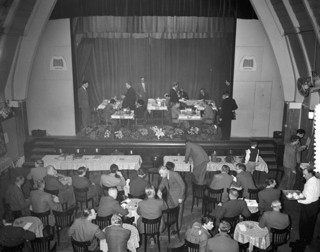 Ровно 70 лет назад, в 1956 году, это произошло в Амстердаме. Александр Рюб, бывший и первый президент ФИДЕ, делает первый ход в партии Смыслов — Сабо, а главный арбитр Эйве наблюдает за этим. Далее — вид изнутри игрового зала, павильона «Минерва».