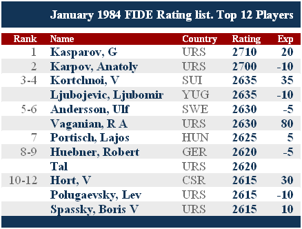 Каспаров вошел в десятку в 17 лет, возглавил мировой список в 20. |
