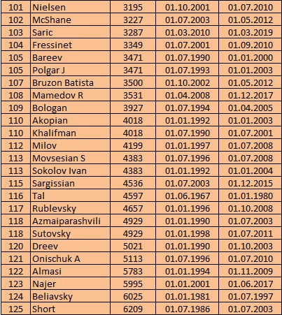 Попобуйте, например, получить такой же список Топ-100 за прошлый месяц (май). Вы сильно удивитесь, обнаружив в конце списка явно "не тех". И не обнаружив в нем не только тех россиян, которые перешли под флаг ФИДЕ (девять человек, в действительности входящих в первую сотню), но почему-то ещё и В.Малахова (который флага не менял, и из Топ-100 не выпадал).