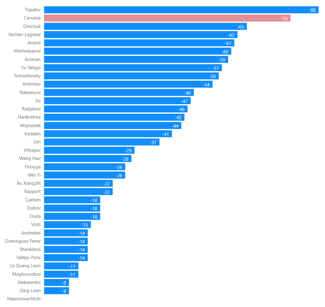 Заметил, что Каруана очень сильно упал в рейтинге и стало интересно посчитать, самое ли это большое падение от своего максимального официального рейтинга на данный момент. Итог (для всех семисотников):