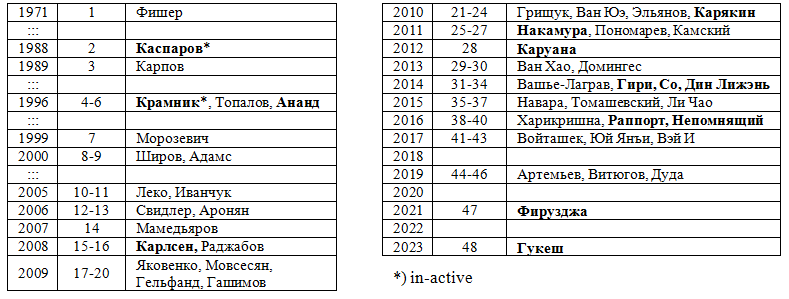 И теперь тех, которые от 2700 на расстоянии "одной партии, выигранной у Карлсена" (plotkin) почти что два десятка! То есть, теперь "движение вверх заметно вероятнее" - ну, посмотрим, посмотрим.