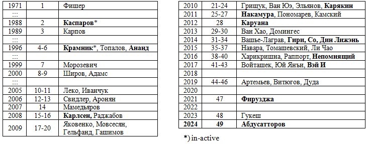 А Домингес, хотя в Топ-10 и не новичок (до этого года уже пять раз входил), но в январской десятке впервые. И если вдруг окажется в Топ-10 и в январе следующего, 2025-го, то придется повышать его в звании. И тогда это будет первый случай за четверть века, когда критерий присвоения звания мега-гипер-гроссмейстера (два января подряд в Топ-10) может быть поставлен под некоторое сомнение. Ибо в славном ряду всего лишь шестнадцати (!) мегагипергроссмейстеров этих двадцати пяти лет имя Домингеса, при всем уважении, смотрится несколько чужеродно.