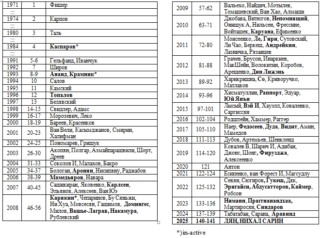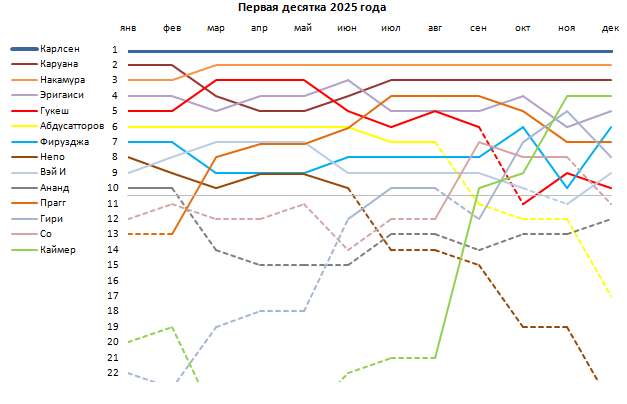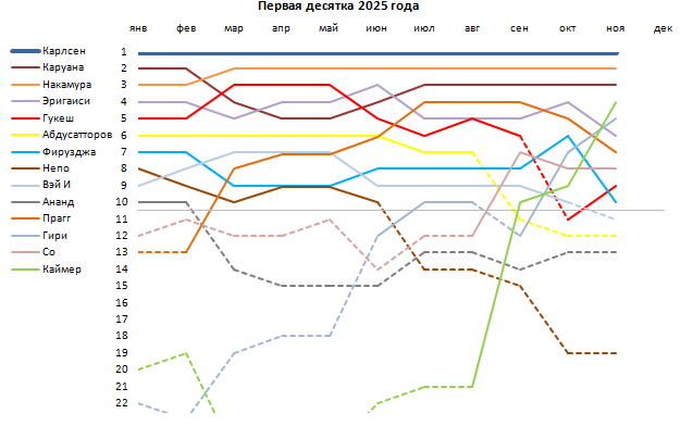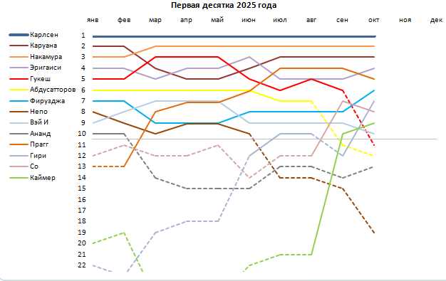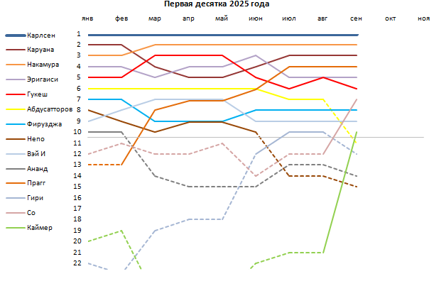 В сентябре 2024 года средний рейтинг топ-50 составлял 2721,2. В 2025 году он был 2722, то есть вырос на 0,8 очка. Однако рейтинг игроков с 51-го по 100-е место упал с 2654,4 до 2649.