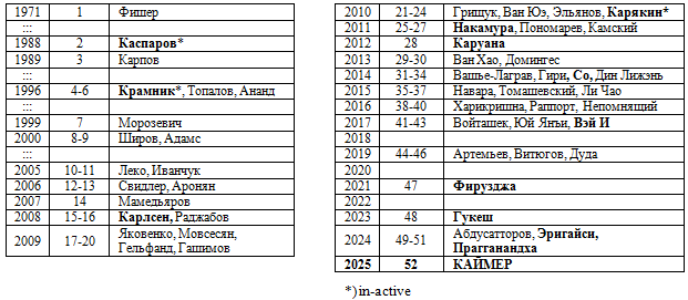Почитатель: Больше трех лет прошло с тех пор как планка топ-десятки свалилась ниже 2760, и казалось, что возврата к прошлому не будет. Однако дружные усилия Каймера, Гири и Гукеша в Европе, а также Со в Америке - и 1 ноября возвращаются старые времена.