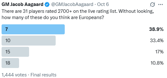 На данный момент в сентябрьском списке ФИДЕ 31 игрок имеет рейтинг выше 2700. Играют 20. (обратите внимание, что такие игроки, как Магсудлу, которые пересекли 2700 с 1 сентября, не могут быть включены в статистику в этом месяце, но будут включены в следующем).