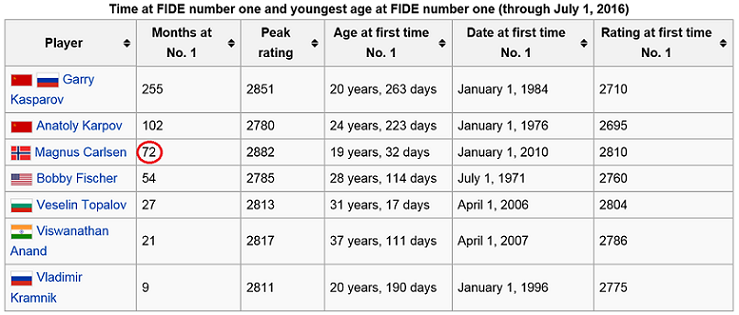 В календарном измерении на это у чемпиона мира ушло ровно шесть с половиной лет, поскольку Виши Ананд на короткий период в трёх списках ”прерывал”) Магнуса в начале его доминации как №1 именно на шесть месяцев. Тогда списки покрывали двухмесячный период, и Виши был первым в списке "ноябрь-2010", а также в списках "март 2011” и (оба не играли) ”май 2011". В этих списках Ананд опережал Карлсена каждый раз на два ЭЛО.