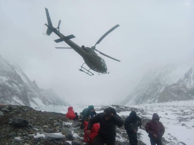 к обеду местного все спустились вроде в лагерь к ожидавшим (и поднимавшимися к ним навстречу) 2-м другим полякам. час назад вертолеты (если сложилось с погодой, там все на тоненького держится) должны были всех эвакуировать в скарду. обмороженную училку в исламабад и францию, а спасателей обратно в к-2 (через пару-тройку дней, когда вернется погода-там глухо пока).