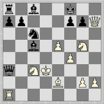 В случае 26...Nf6+ 27.Kf5! fe+ 28.Kg5 Qxc3 29.Qxb7+ черные играют не 29...Nd7?! (тут Широв доказал преимущество белых), а 29...Kf8! (Дворецкий) с полноправной контригрой. Поэтому вместо 28.Kg5?! надо продолжать 28.Kg6! Qxc3 29.Qxb7+ Nd7 30.Kh5, и здесь ресурсы черных, по-видимому, недостаточны. Вот примерный вариант: 30...Bd6!? 31.Bb5! [31.g3 Qc2] 31...Bc7 32.Qc6! [32.Bxd7 Qc5+ 33.Kh4 Qf5!?=] 32...g6+ 33.Kg4 Nf6+ 34.Kg5 Bxf4+ 35.Kxg6 Qxc6 36.Bxc6 с выигранным эндшпилем (Дворецкий). Вместо шаха конем правильно грубое 26...Qxc3!, и далее по Широву: 27.Qxb7 Kxe6 28.Qd5+ Ke7 29.Qc4! Nc5+ 30.Kf5! [30.Kd5? Qd2+ 31.Qd4 Qa2+ 32.Kc6 Qe6+ 33.Kb5 Qb6+ 34.Kc4 a5! с атакой] 30...Qf6+ 31.Kg4 Qg6+ 32.Kf3 Qc6+ 33.Ke3 a5! 34.h4!. В заключительной позиции варианта черные, по мнению Широва, еще испытывают некоторые трудности, хотя ничейный исход борьбы наиболее вероятен. А теперь вернемся к самому началу варианта - к позиции после 21.Ng5!. Откажемся от рассматриваемого Шировым взятия пешки a3, в пользу 21...Bb3!.