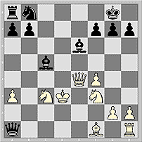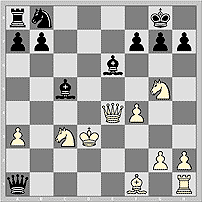 Широв дает вариант 23...Nb4+ 24.Kc4 Qxa1 25.Qh8+ Ke7 26.Qxg7 Be6+ 27.Nxe6 Qa6+, и черные побеждают. Однако белых выручает 25.Qh5! (вместо 25.Qh8+?). Задачу решает эффектное 23...Bf5+!! 24.Qxf5 Rd8+ 25.Ke4 Qb4+ 26.Kf3 Nd4+ 27.Kg4 Nxf5 После хода в партии перед черными встала нелегкая дилемма: чем съесть пешку. В принципе, оба взятия возможны, хотя надежнее, пожалуй, 20...Bxe6!.