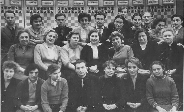 Кишинев, 1958 г. Полуфинал XIX первенства СССР (1. Л.Якир без поражений, победа над Л.Руденко). Верхний ряд слева направо: Куре (Таллинн), Орав (Таллинн), Нальтинг (Таллинн), О.Кацкова (Москва), Т.Горбулева (Баку, будущий тренер Г.Каспарова в бакинском Дворце пионеров), Н.Коноплева (Москва), Л.Руденко (Ленинград), Э.Гольдберг (Киев), Н.Колотий (Москва). Средний ряд: судья, Э.Какабадзе (Тбилиси), Л.Идельчик (Харьков), Томсон (гл. судья, Москва), Л.Якир (Киев), К.Сопровская (Москва). Нижний ряд: Б.Мосионжик (Кишинев), судья (из архива Л.Якир).