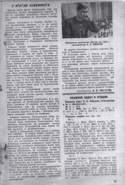 Конечно, Ариадна не могла знать, что Евгений в конце 1942-го находился в Москве, а доказательством этому служат два его этюда, опубликованные в бюллетене 22-го чемпионата столицы и посвященные победившему в чемпионате Василию Смыслову.