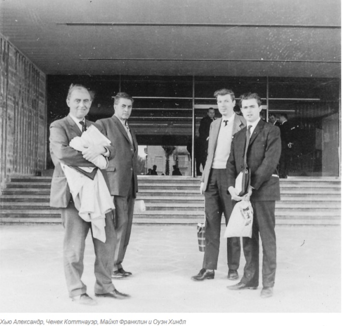 Доктор Джеймс Айткен на зональном в Энсхеде (Нидерланды), 1963 год (невидимый соперник – Мирослав Филип). Второй слева – Джонатан Пенроуз (Источник – https://www.saund.co.uk/britbase/pgn/aitkenj-viewer.html)